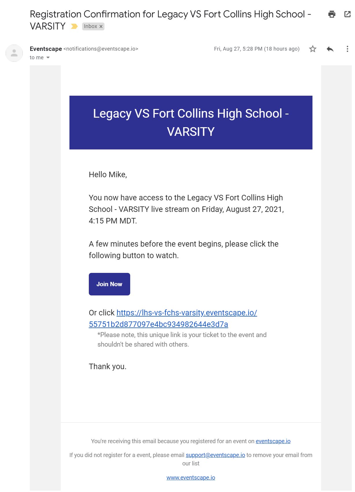 The first email you receive (left image) will simply contain your receipt - you do not need to take any action on this email. The second email you receive (right image) will contain access to watch your live stream. This email may end up in your spam. If you do not see it immediately, please search your for and email from
